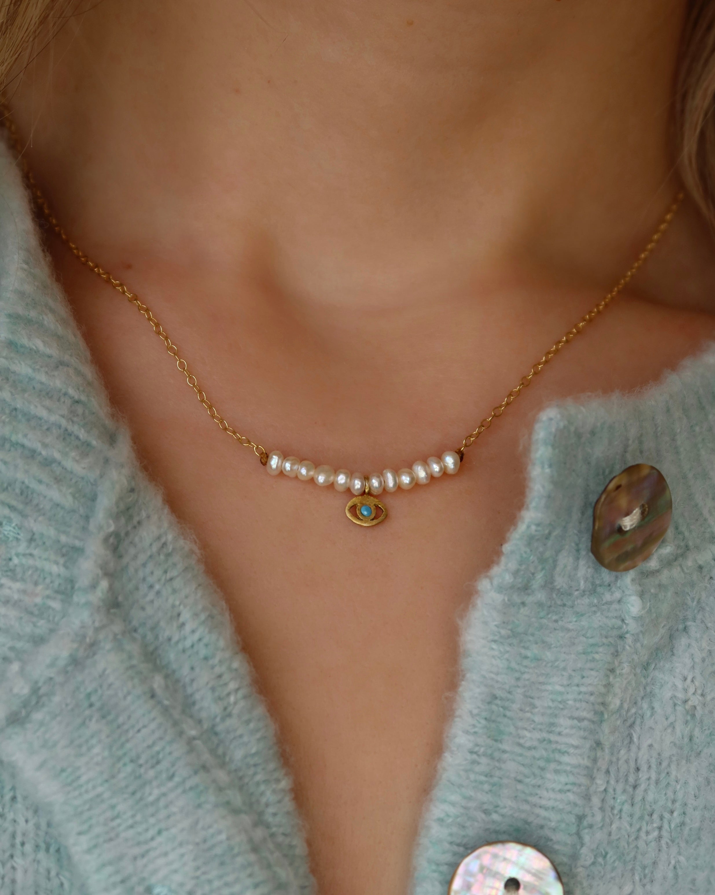 Handcrafted in Athens, Greece, this protective "evil eye" necklace pairs timeless symbolism with understated elegance. A small turquoise gemstone-accented evil eye charm sits at the center of a row of freshwater pearls, creating a unique, meaningful design made for everyday wear. The evil eye is traditionally believed to ward off negative energy and protect its wearer from evil, jealousy, etc.
