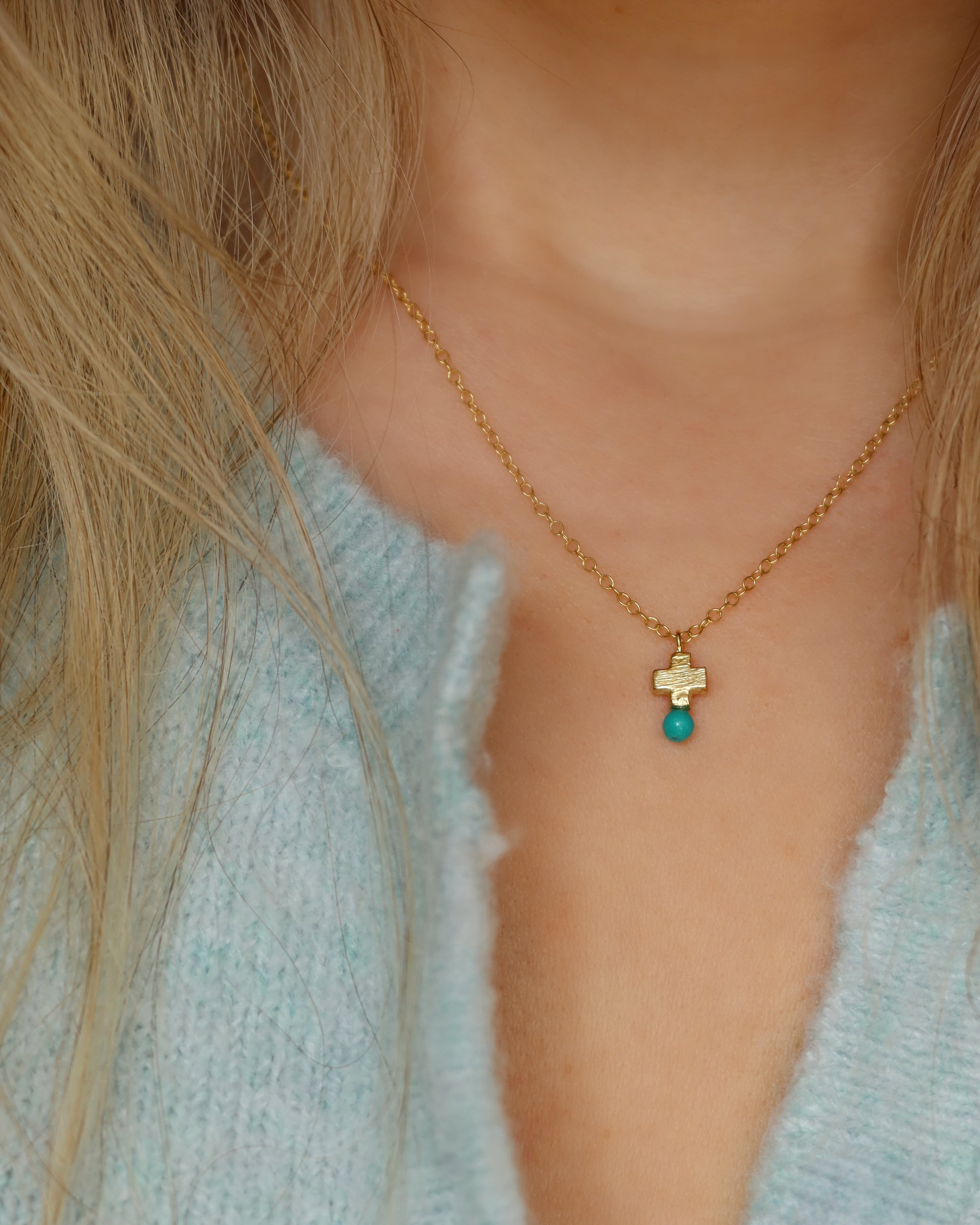 This dainty cross necklace has been handmade with love in Athens, Greece and features a mini cross pendant with a blue howlite accent at the bottom for a pop of color. In Greek tradition, blue beads are associated with spiritual protection, a sentiment thoughtfully reflected in this design.
