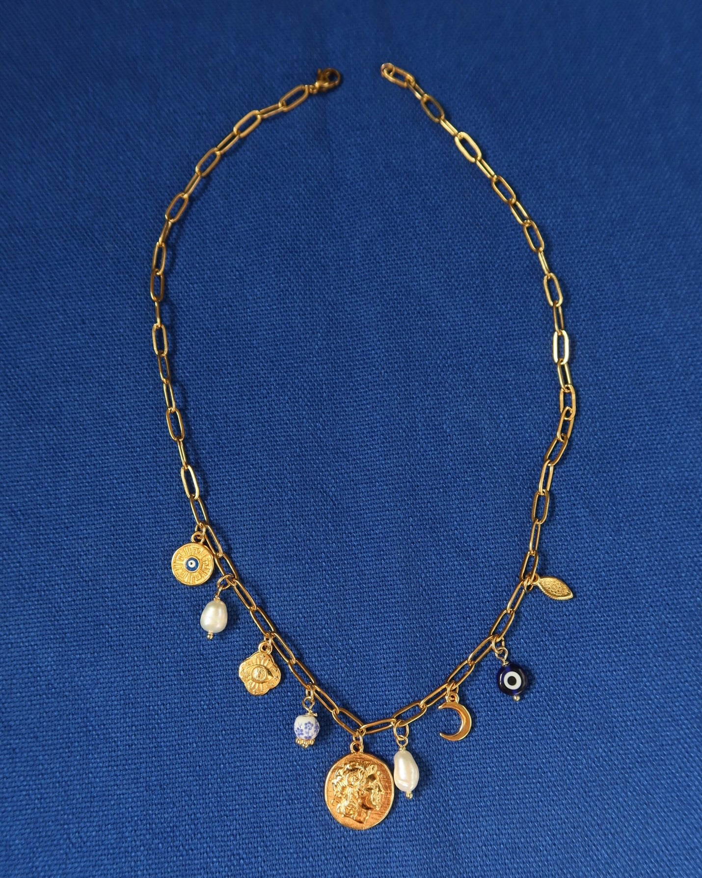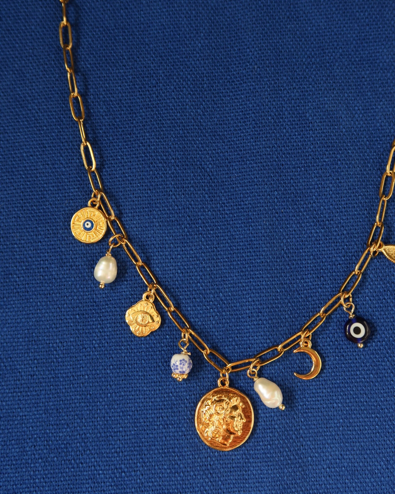 Strung along a gold-tone stainless steel paperclip chain, this charm necklace features freshwater pearls, protective evil eyes, and a replica of an ancient coin featuring Alexander the Great on one side, and the Vegina Sun on the other. The Vergina Sun is an ancient symbol of royalty, power, and divine light, while Alexander the Great was a fearless warrior-king who conquered empires with bold vision, brilliant strategy, and unmatched courage.