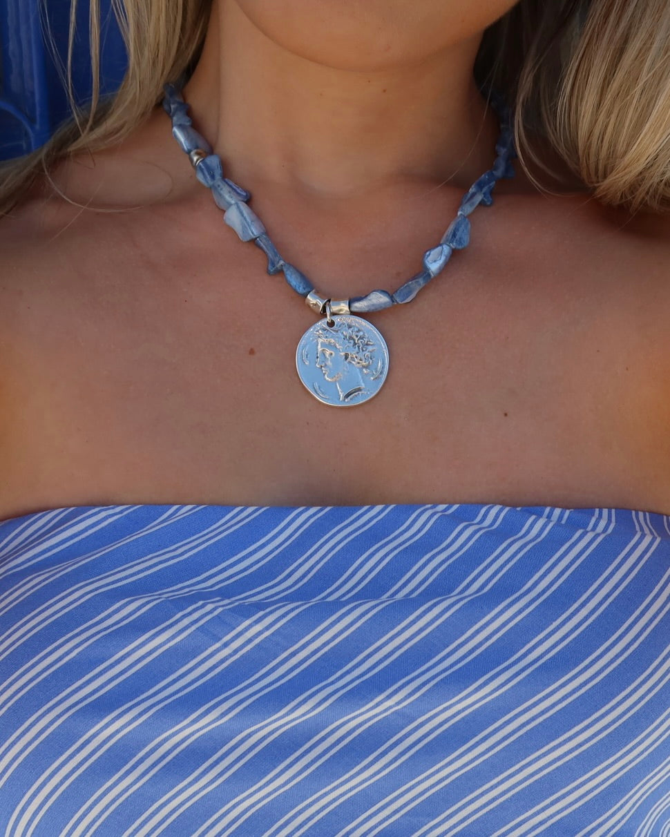 The pendant is paired with iridescent blue beads made from shells that remind us of the tranquil beauty of Greek waters. Each bead is uniquely shaped, creating soft variations in tone and luster that make every necklace truly one of a kind.