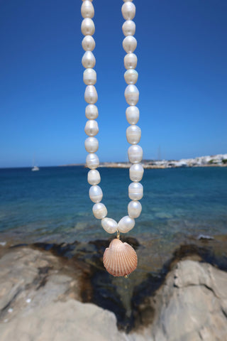 Freshwater pearl necklace on a model at the beach with a summer aesthetic - jewelry made in Greece