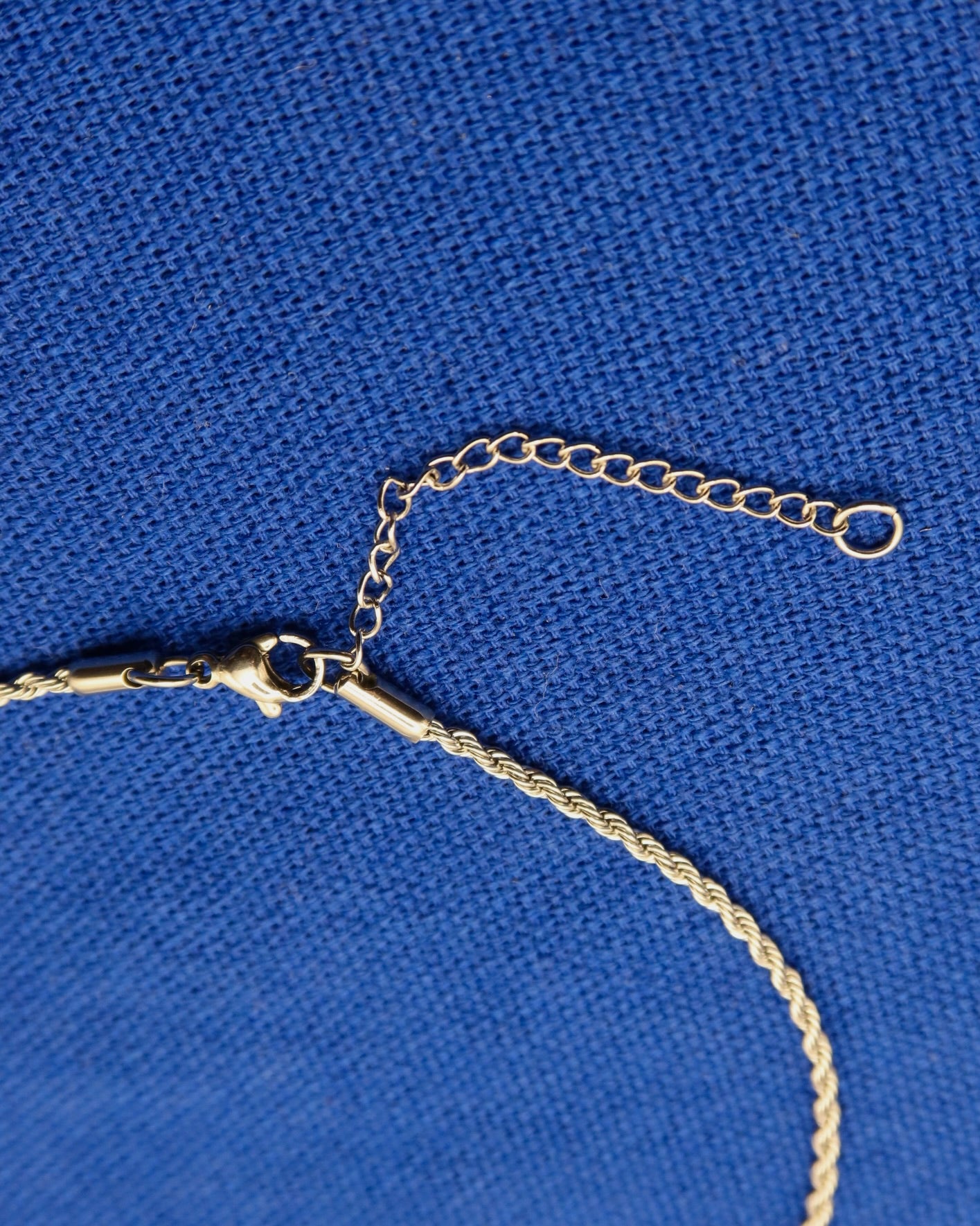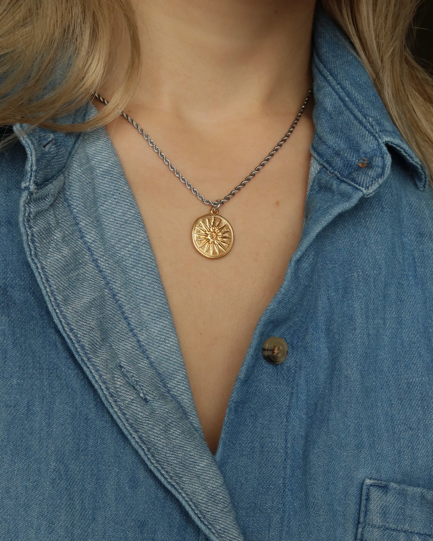 Crafted with a silver stainless steel rope chain and a gold-tone brass, double-sided round pendant, this piece balances durability with sophistication.