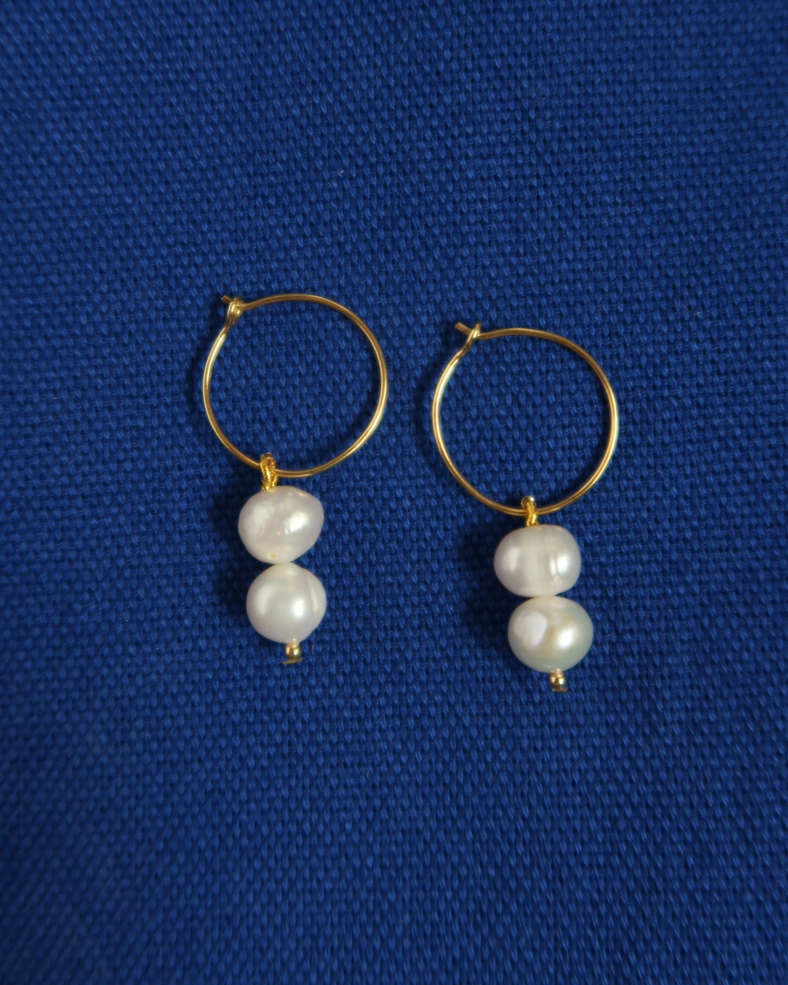 Handmade in Greece from gold-plated sterling silver, these elegant hoop earrings feature two freshwater pearls on each, suspended from a sleek, minimalist silhouette. Timeless yet modern, they’re the perfect everyday luxury piece that adds a soft, luminous touch to any look.