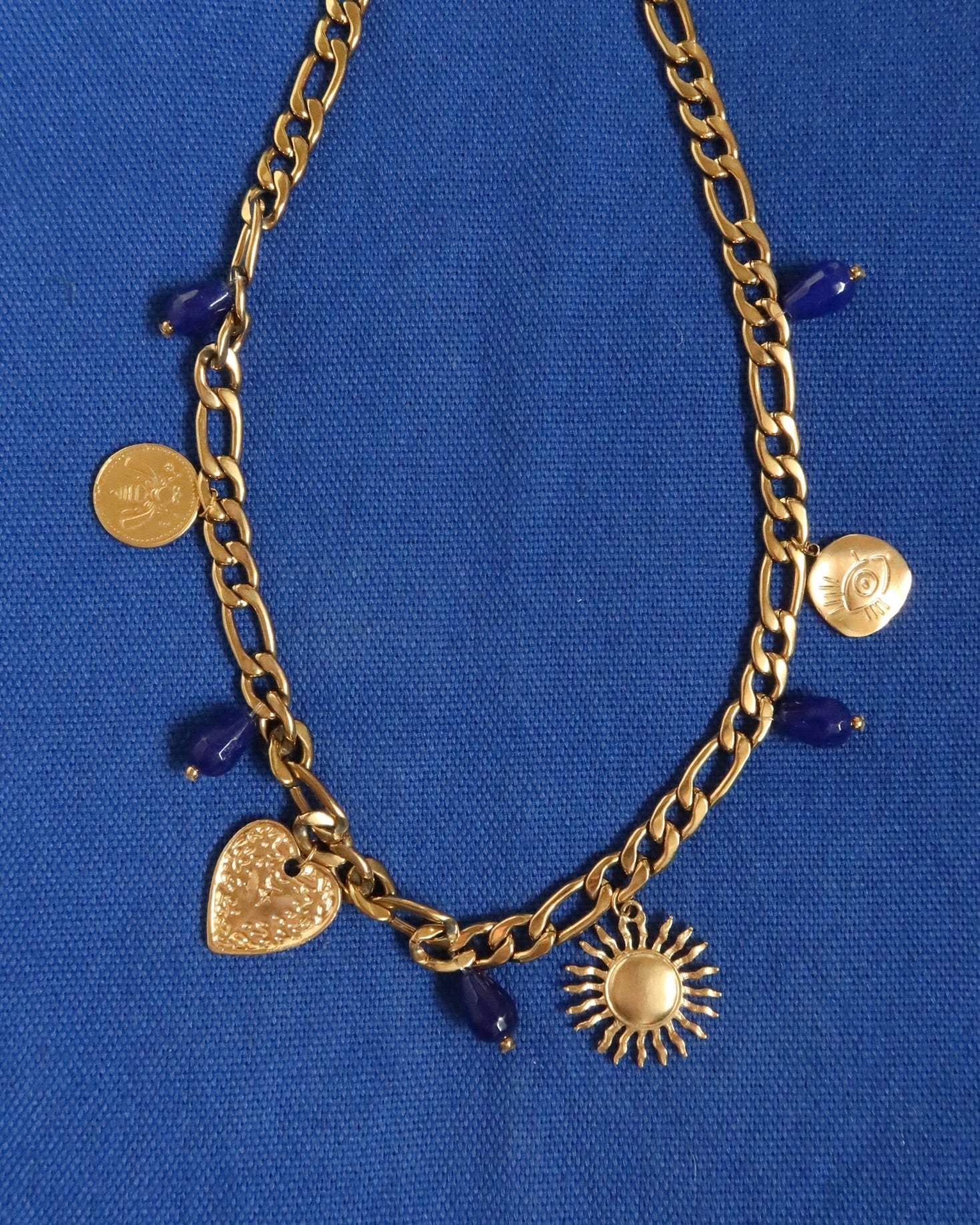 Handcrafted in Athens, Greece, this statement charm necklace brings together powerful symbols of light, love, protection, and abundance in one bold, eye-catching design. Accented with rich blue beads and finished with a substantial lobster clasp, this Greek charm necklace is designed to stand on its own—effortless, expressive, and full of meaning.