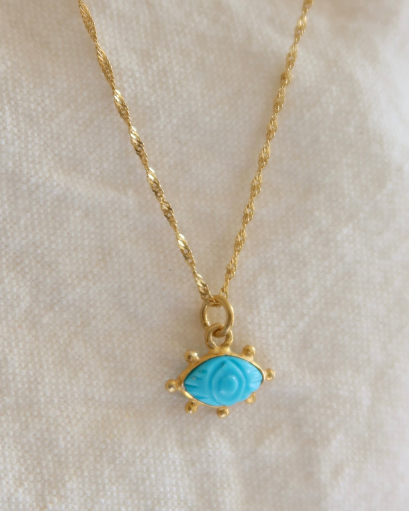 Rooted in centuries of Greek tradition, this turquoise evil eye necklace is a timeless symbol of protection, clarity, and calm. Handcrafted in Athens, Greece, the carved evil eye charm reflects the enduring belief in warding off negative energy while inviting balance and peace into everyday life. The vibrant turquoise hue adds a fresh pop of color, making this piece both meaningful and effortlessly wearable.