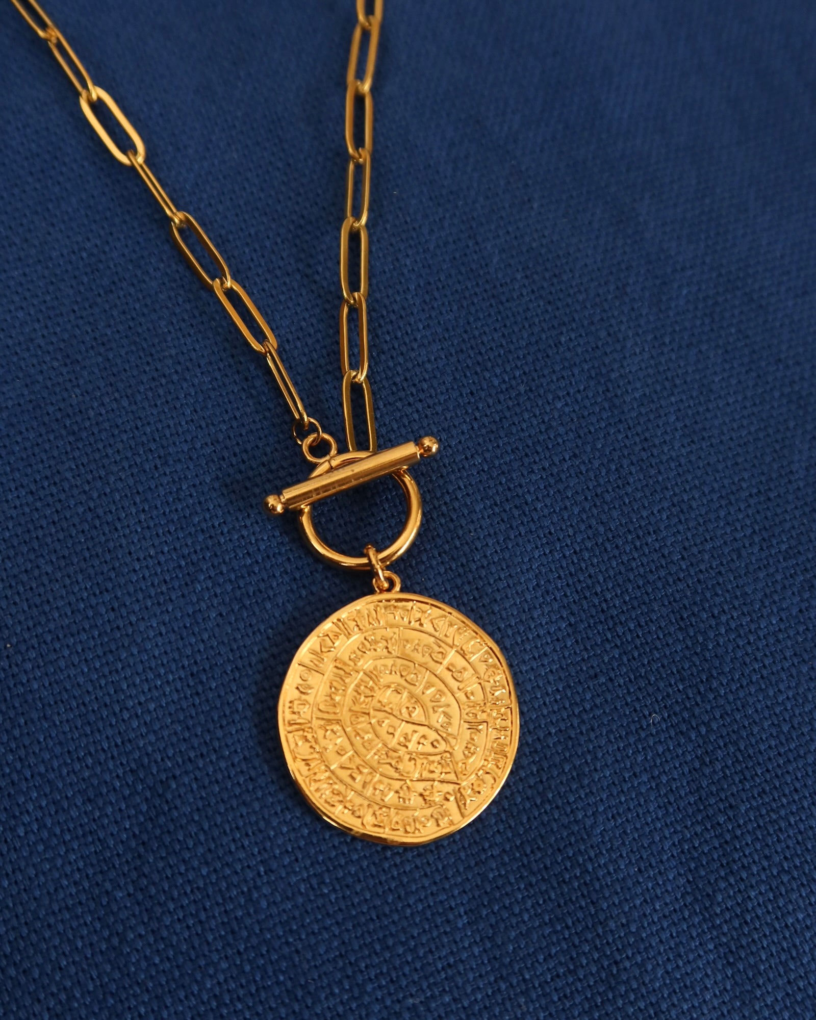 Channel the mystery and artistry of ancient Crete with this Phaistos Disc Pendant Necklace, handcrafted in Athens, Greece. Featuring one of the most fascinating symbols of ancient Greek and Minoan history, the Phaistos Disc is believed to represent communication, creativity, and the enduring quest for knowledge—making this piece both visually striking and deeply meaningful.